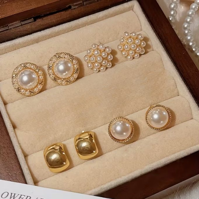 This plan brings together several pairs of earrings featuring pearl elements and smooth gold-toned shapes. The set includes varied designs, from classic round settings to compositions made of small pearls that create a soft sense of volume. This combination allows you to adjust the mood of an outfit depending on style and occasion. The earrings look cohesive together and can be easily mixed and matched. The collection reflects a calm, light aesthetic suitable for different seasons.