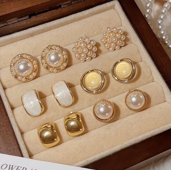 This plan brings together a complete selection of earrings featuring varied shapes and pearl accents within one cohesive set. The collection combines smooth gold-toned surfaces, light-toned inlays, and clustered pearl-style elements to create a soft visual rhythm. Each pair has its own character while sharing a unified aesthetic. The earrings can be rotated depending on outfit style and daily mood. The collection feels balanced and supports a wide range of looks throughout the year.Includes
