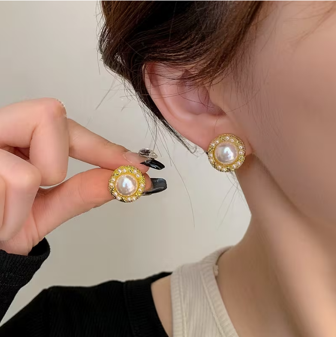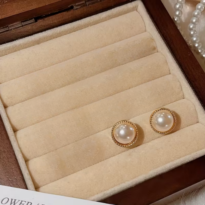 This plan includes a pair of earrings with a pearl accent set in a round frame with a warm gold-toned finish. The fine textured edge adds depth and makes the design more distinctive. These earrings feel understated and suitable for daily wear, while also fitting well for occasions. The round silhouette complements different face shapes and pairs naturally with other jewelry. It’s a neat detail that carries a vintage mood without extra elements.
